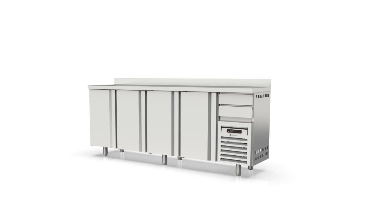 - Plan de travail en acier inoxydable AISI-304 avec façade droite et dosseret sanitaire